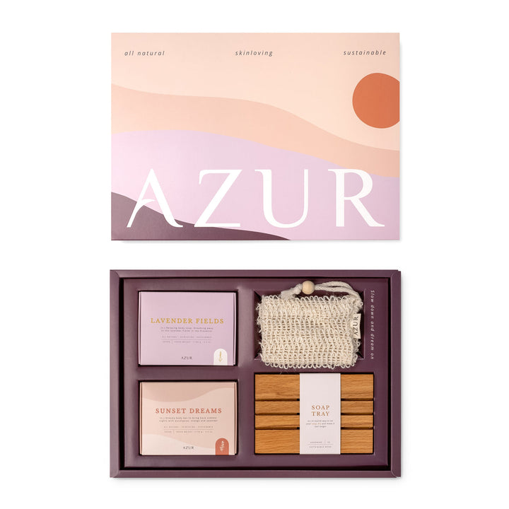 Deze gift set combineert twee zachte, verzorgende body bars met handige, plasticvrije accessoires – allemaal mooi verpakt en perfect om cadeau te geven of stijlvol in je badkamer neer te zetten.